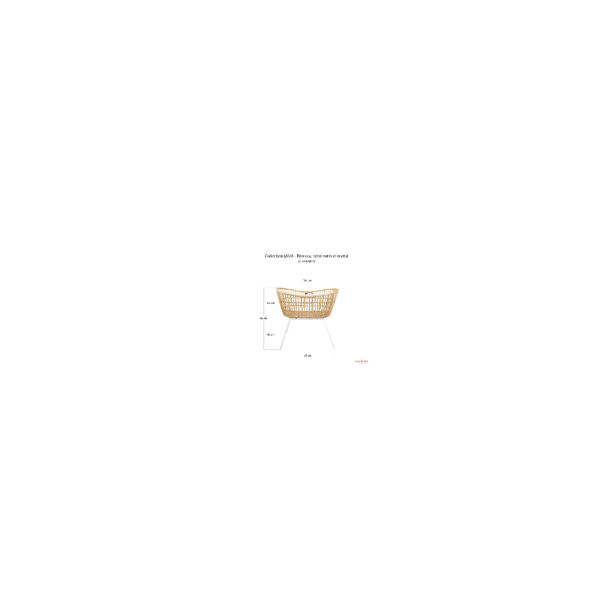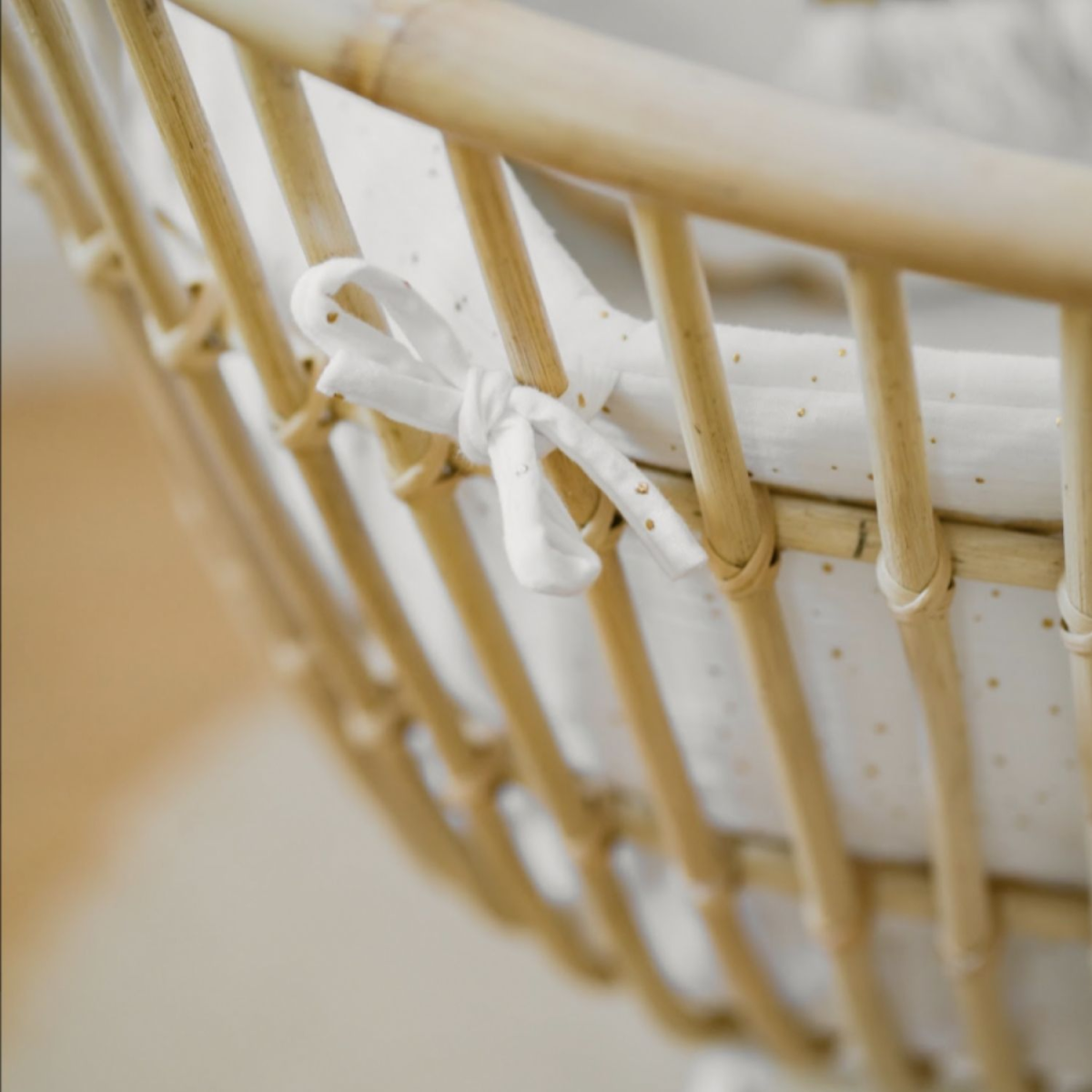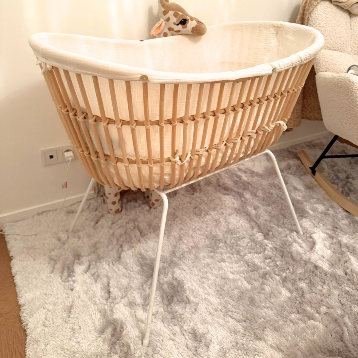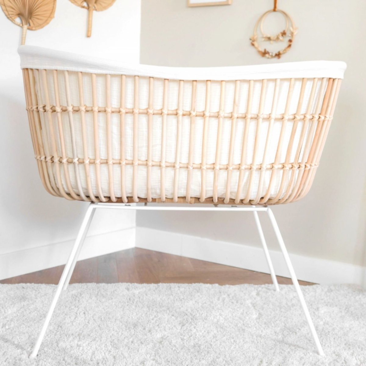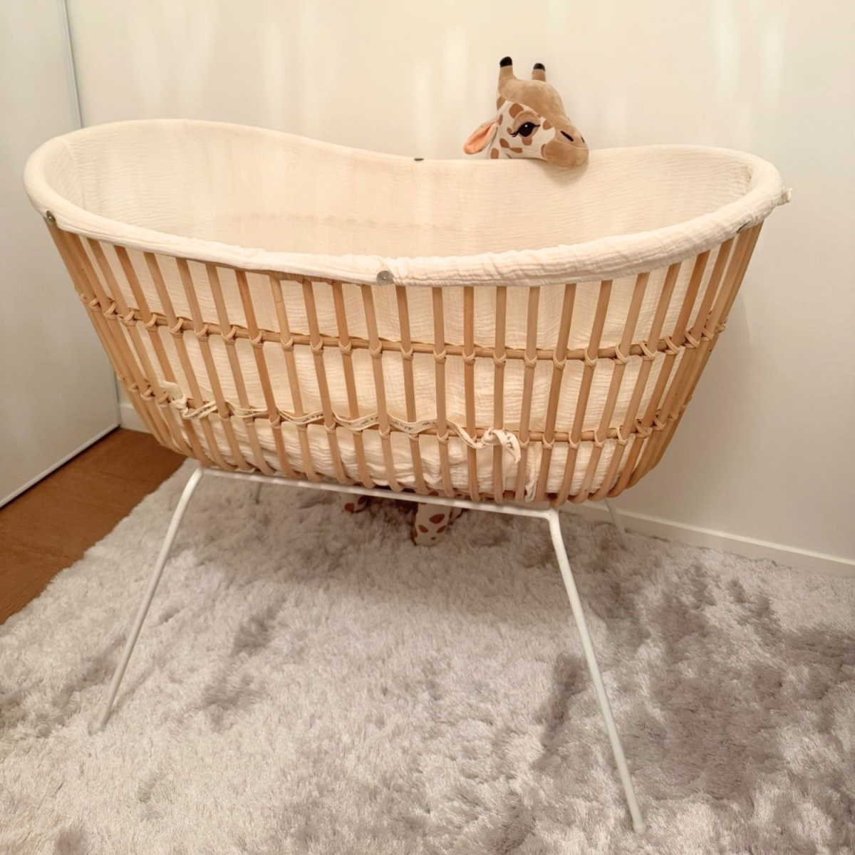 Berceau rotin pieds métal JAVA BLANC avec matelas et habillage en double gaze de coton écru.