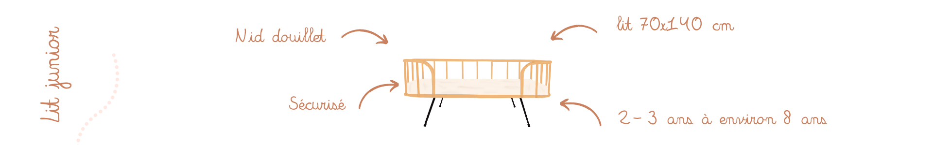 Vous pouvez tout à fait choisir de zapper également le lit junior, et si le lit adulte que vous avez choisi ne vous semble pas assez sécurisé ou si les bords sont complètement ouverts, il existe des barrières amovibles qui se calent entre le sommier et le matelas et empêchent l'enfant de rouler à terre la nuit.