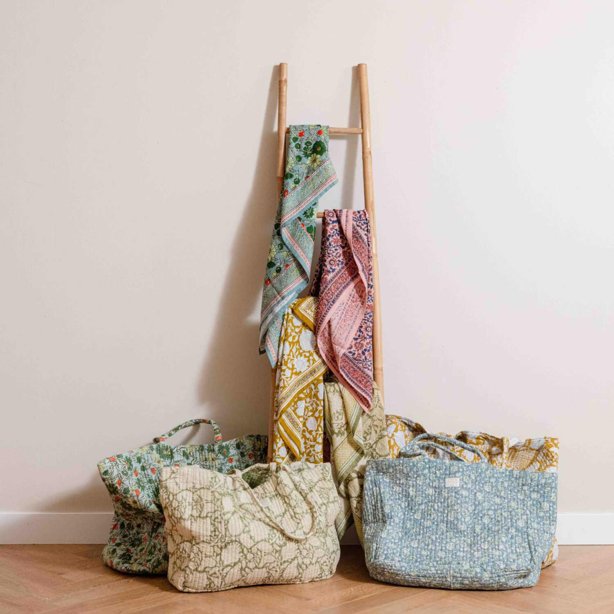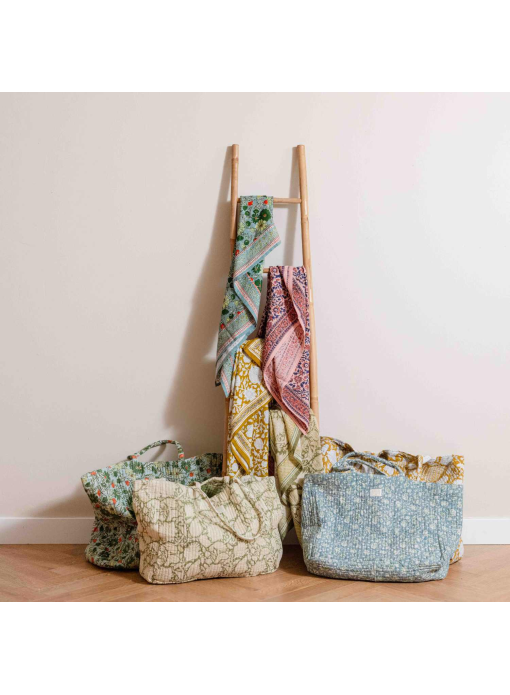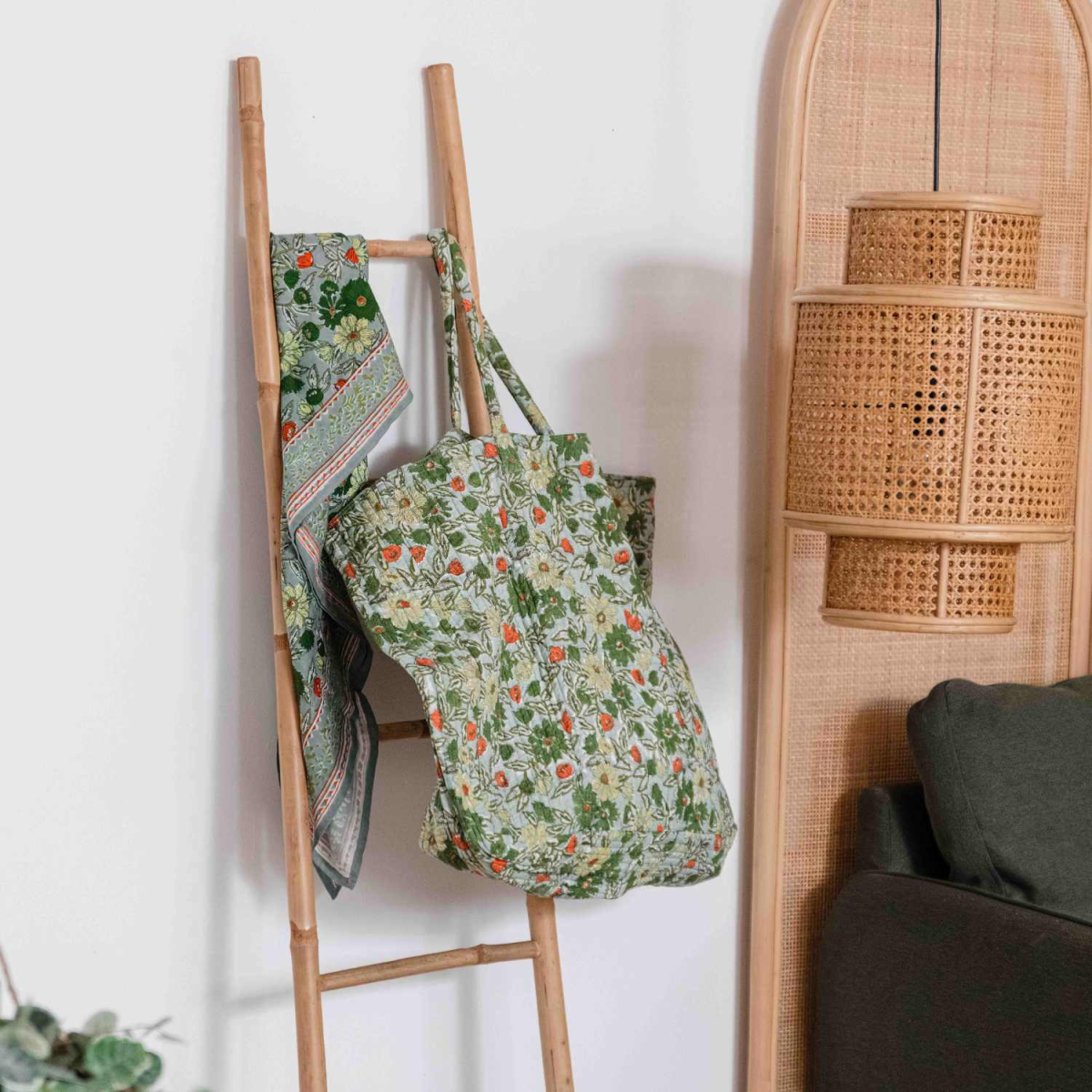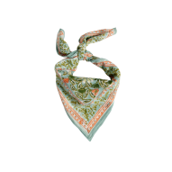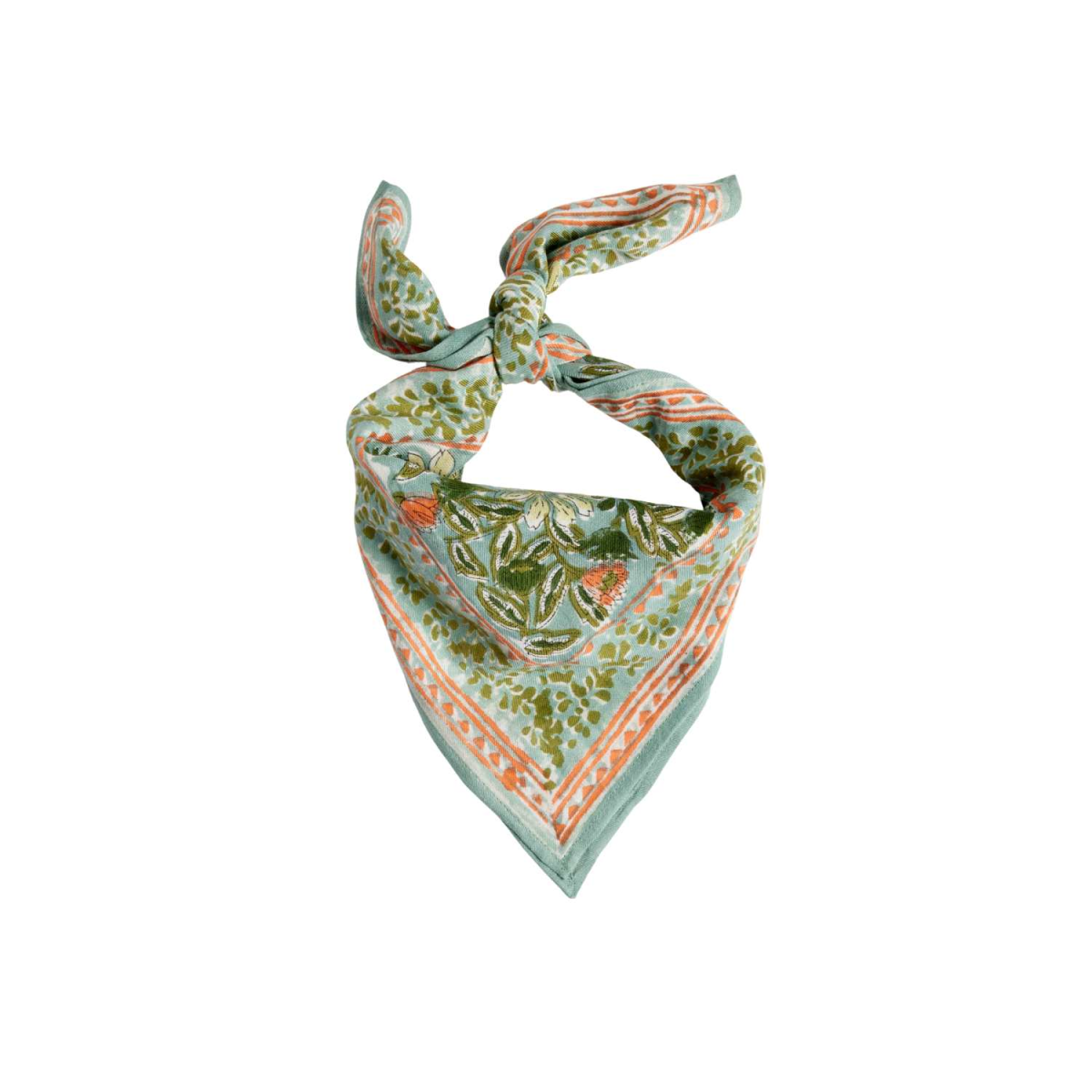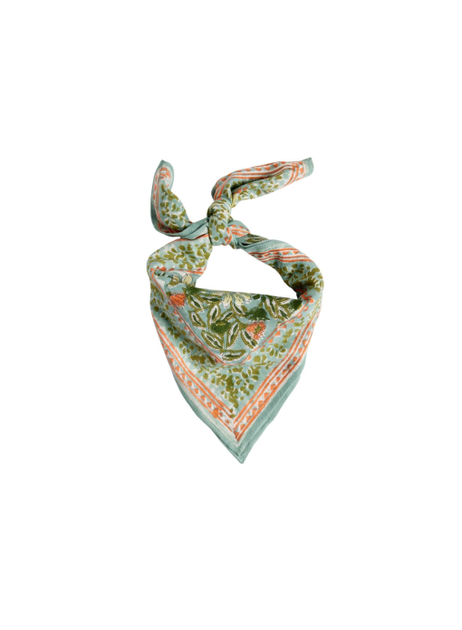 Foulard 100% coton imprimé indien "Block print" dans une très jolie gamme de vert et de bleu très harmonieux & une jolie touche de corail!