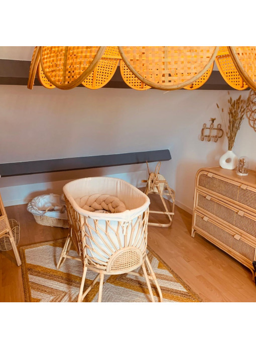 Vendu avec son pied en rotin fixe, son habillage en double gaze de coton écru et son matelas.