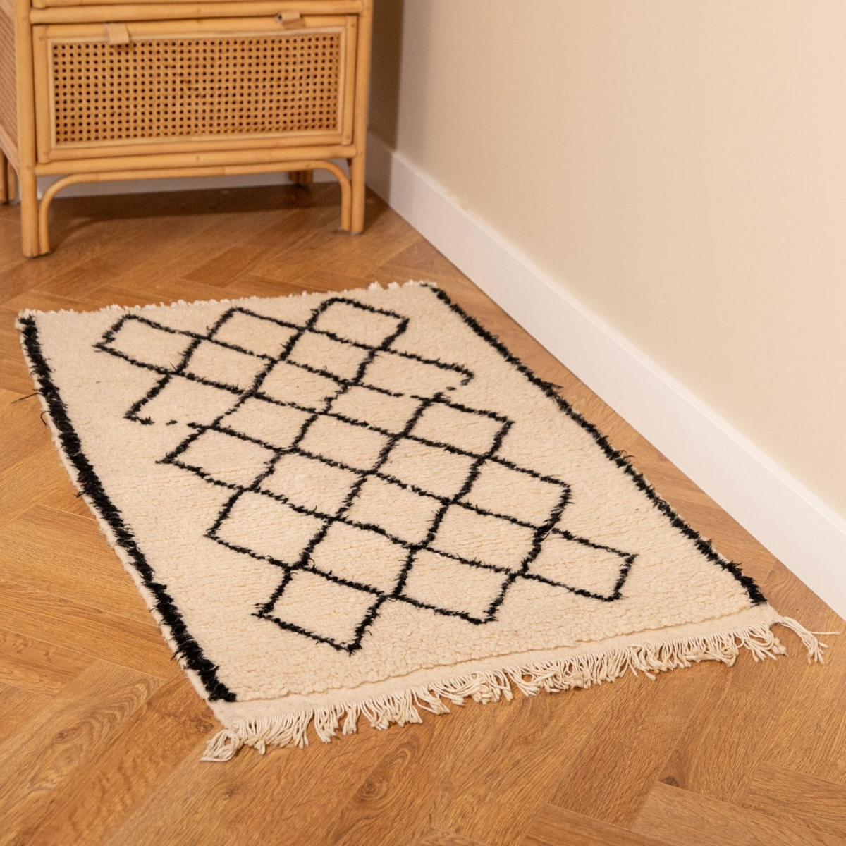 Arrivé tout droit du Maroc, découvrez cet adorable Beni Ouarain pure laine aux nombreux losanges noir.